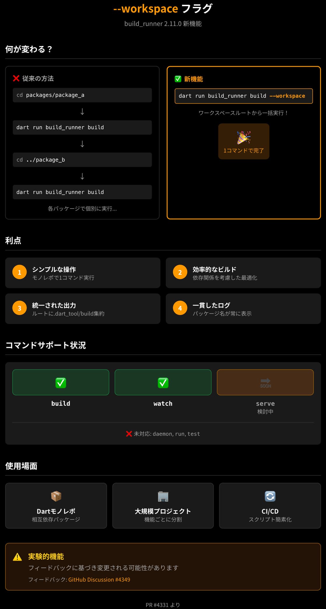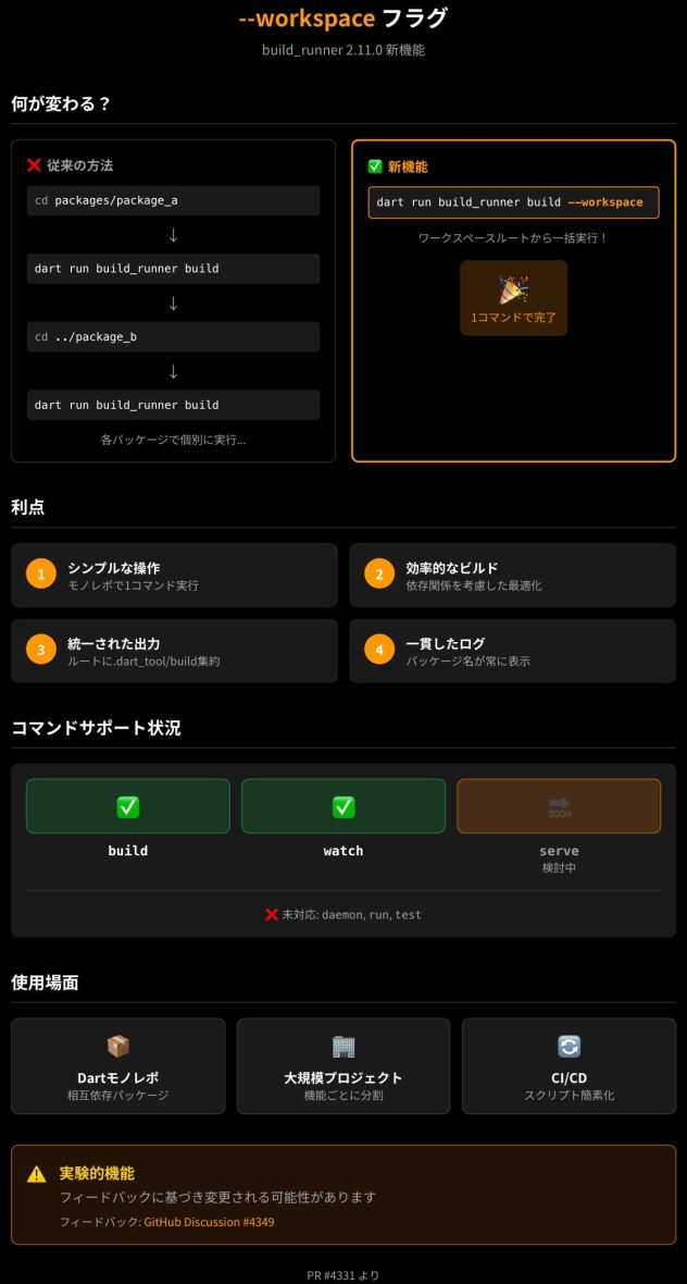 --workspaceフラグ、モノレポでbuild_runnerを使っている方には待望の機能ではないでしょうか。まだ実験的機能ではありますが、早速試してみる価値はあると思います。